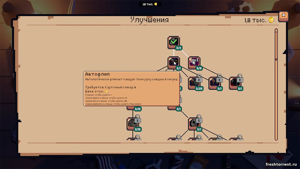 Геймплей строится на простом цикле: кликайте или автоматизируйте переворот карт для заработка монет по их номиналу и комбинациям (пары, стрейты, флеши), инвестируя в расширение руки до 7+ карт, покупку новых колод и параллельные "руки" для экспоненциального роста. Отправляйте миньонов в экспедиции за редкими картами с мультимастностью или бонусами, удаляйте хлам из колоды для оптимизации и покупайте апгрейды, ускоряющие автоматику и множители.