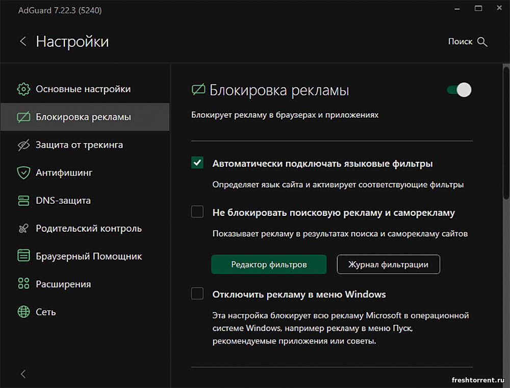 База Adguard ежедневно обновляется, так что он оперативно отрабатывает даже по баннерам новых форматов и издателей. То же самое качается всплывающих окон, кликандеров, тизеров, контекстных объявлений. Также идет борьба и с вредоносными и мошенническими сайтами. А для ограничения детей от нежелательных (взрослых) материалов предусмотрен родительский контроль. Задайте типы содержимого, которые не стоит видеть ребенку, и оно будет в онлайн режиме удаляться со страниц.