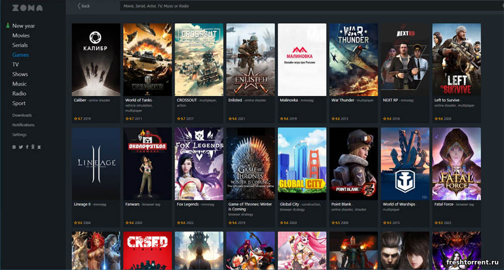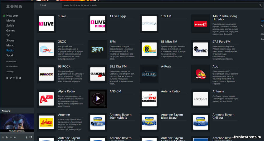 В этой программе можно смотреть и скачивать Zona фильмы и сериалы, ТВ каналы, трансляции спортивных мероприятий, слушать музыку и радиостанции. И все это доступно бесплатно и без вирусов, можете убедиться сами. А благодаря огромному внутреннему каталогу вам не придется даже искать сами файл в интернете.