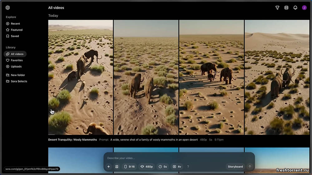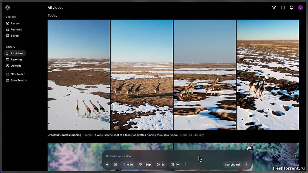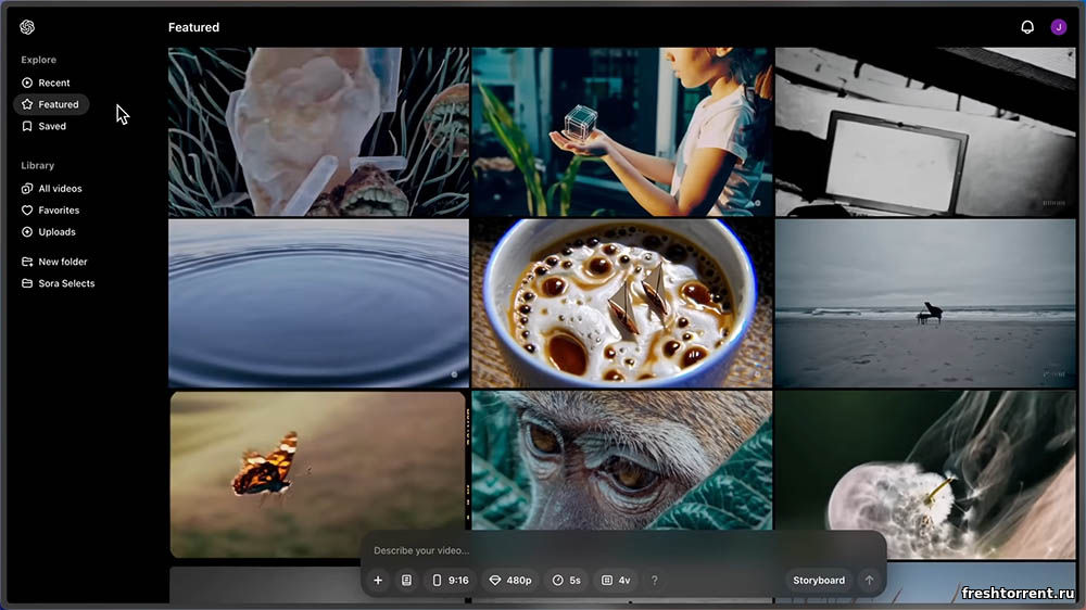 Основной принцип работы Сора заключается в преобразовании описаний, заданных пользователем, в визуальный видеоряд, который можно дополнительно редактировать. Приложение поддерживает загрузку изображений и видео для обработки, позволяет создавать бесконечно зацикленные анимации, смешивать ролики и выбирать разные стили, например, «архивный фильм» или «стоп-моушен». Интерфейс интуитивно понятен и не требует специальных знаний для написания запросов, обеспечивая широкий доступ к профессиональному видеоконтенту. Среди дополнительных функций — настройка соотношения сторон, длительности и просмотр галереи готовых видео от других пользователей.